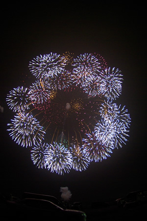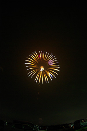 今回は天気が悪く、霧雨が弱く降っている。観賞場所を決めたら、花火と共に楽しみの出店の食べ物で腹ごしらえ。決して美味いというわけではないのだが、こういう場所では出店の食べ物を買ってしまう。食べ終わる頃には霧雨が強くなってきて、土手の斜面でシートを敷いて傘を差して座っていると、シートの上の方から雨水が滴り流れてきて、徐々にケツから濡れていくのに耐え切れず車で鑑賞する事にした。運良く花火が上がるころには雨は止んだ。花火大会が中止になるくらいに雨が強くならなくて良かった。花火は近くで上がるので迫力があって良かった。特に二尺玉は凄かった。ただスターマインとか連続して花火が上がると、煙が篭って見えなくなることが何度かあって残念だった。場所が悪かったんだな、きっと。場所が悪いと言えば、車を止めた場所が花火の燃えカスが落下する範囲内だったって事。次の日に車見たらカスだらけだった(T T;