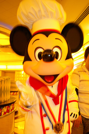 夕食の為に夕方起きる。ちょっと寝たくらいじゃ風邪は治ってないね。夕食はアンバサダーホテルのシェフミッキーへ。ブッフェスタイルでここもキャラクターが各テーブルに回って来る。通路側に背を向けて座っていると肩を叩かれるので振り向くとミッキーが居たりとちょっと驚く。記念に一枚パシャリ!